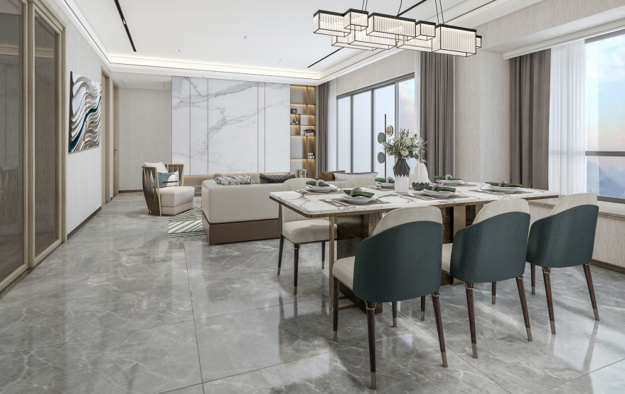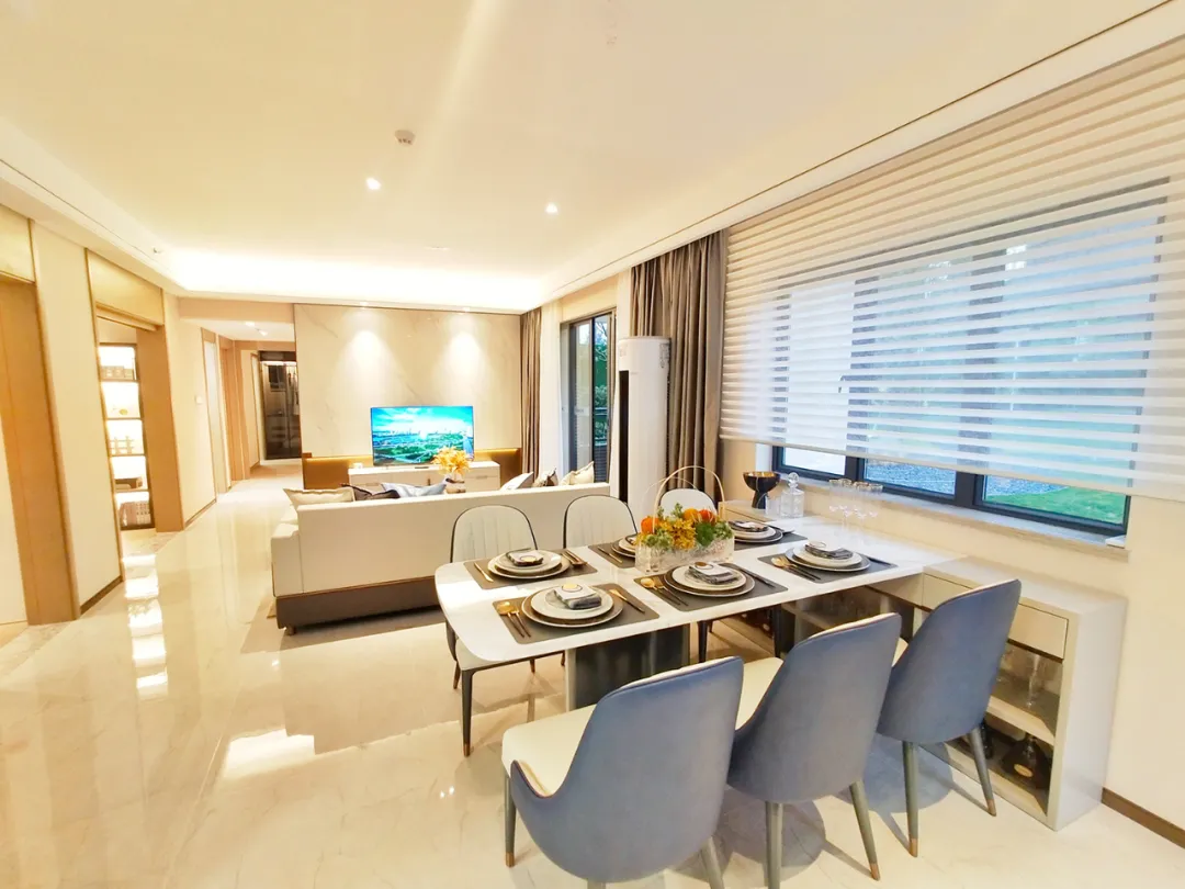 218㎡天际海幕板房,餐客厅一体化联通南北,客厅开间约5.1米,层高约3.15米,空间通透明亮,尺度舒适宽敞。南向约7.9米L型阳台,打开玻璃推拉门,室外美景映入眼帘,简直就是美景最佳观望台。